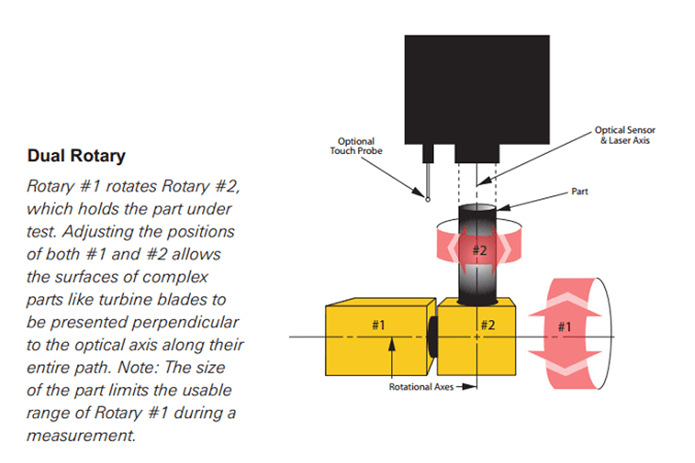 The part under inspection is attached to the secondary rotary, which is mounted to the primary rotary. The part can be rotated in two different axes to provide a means of bringing features with compound angles into the line of sight of the optical sensor axis and within the reach of available laser sensors or touch probes for measurement.